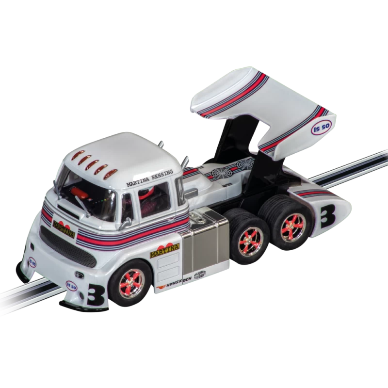 Wil je eens wat anders dan de standaard race-auto’s? Deze truck met gestroomlijnde cabine en gigantische achtervleugel – van het team “Martine Rehzing” – zorgt voor veel bekijks op de thuisracebaan. Daarbij is hij enorm snel en heeft deze Carrera racetruck heldere koplampen.Â