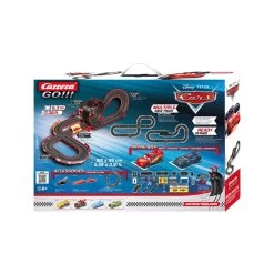 In het donker racen wie wilt dat nou niet? De twee filmhelden Lightning McQueen en Jackson Storm komen in het donker echt tot leven. Met de verlichting van hun koplampen en de fel verlichte reclameboodschappen links en rechts van de rijbaan vinden de twee racewagens hun weg erdoorheen en vechten ze in een enorm spannende wedstrijd in het donker. Maar uiteraard kun je ook gewoon overdag racen en genieten van deze mooie baan. Je waant je door een lus, een viaduct, een smal gedeelte en een kruispunt. Deze bekende Cars auto’s zijn op schaal 1:43.Â