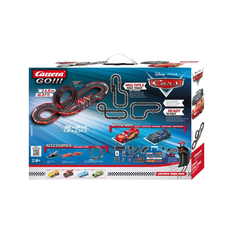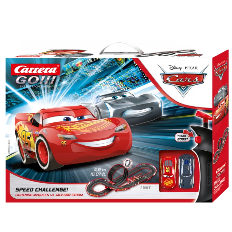 Bliksem McQueen en Jackson Storm staan tegenover elkaar tijdens hun volgende race op misschien wel straks jouw Carrera GO racebaan. De 4,9 meter lange racebaan op schaal 1:43 heeft enkele avontuurlijke chicanes ingebouwd. De route leidt jou en je tegenstanders door verschillende bochten en zelfs door een looping! Je kunt eenvoudig via de handregelaar extra gas geven door op de turboknop te drukken. De twee filmhelden van Disney Pixar Cars McQueen en Storm strijden hier om de Piston Cup.