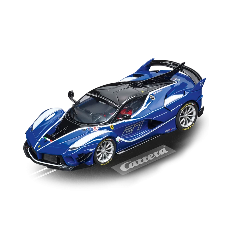 Deze blauwe Ferrari FXX K Evoluzione is een supercar met 1050 PK aan vermogen. Net als in de Formule 1 heeft de FXX K KERS, d.w.z. een schakelbare elektromotor, om de rondetijden te perfectioneren. Een must voor op de baan van elke grote Ferrari en Carrera fan.Â