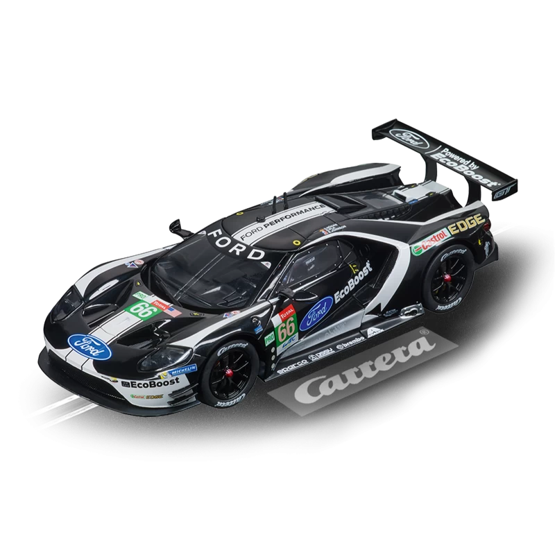 Ter gelegenheid van het 50-jarig jubileum van de International Motorsport Federation IMSA heeft Ford een nieuwe editie van de Ford GT naar de zwaarste endurancerace ter wereld gestuurd. De Ford GT Race Car “No.66” werd gelanceerd als een jubileumversie met het startnummer 66 en het historische Motorcraft-ontwerp. Met meer dan 600 pk onder de motorkap kun je elke tegenstander op zijn plek zetten – op voorwaarde dat je de krachtpatser op het Carrera-circuit kunt temmen. Deze supersportwagen met monocoque en aluminium frame versnelt de geselecteerde eigenaar tot 347 km/u. De normale versie van de twin-turbo V6 heeft 656 pk. De nieuwe editie van het Ford race-icoon moet de Porsches en Audi’s in de GTE Pro-klasse in 2016 opwarmen tijdens de zwaarste endurancerace ter wereld – precies 60 jaar na de eerste Ford-overwinning. De slotwagen is voorzien van voor-, achter- en remlichten. De auto kan digitaal worden bestuurd, maar kan ook analoog worden gebruikt en kan ook individueel worden gecodeerd.