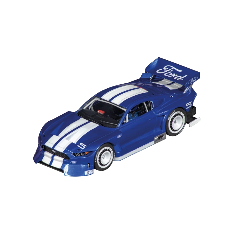 De Ford Mustang bestaat sinds 1964 en is nog steeds een van de meest iconische sportwagens ter wereld – in 2018 rolde de 10 miljoenste Ford Mustang van de assemblagelijn in Michigan. Het model van de Ford Mustang GTY met nummer 5, aangepast door Carrera, is speciaal geoptimaliseerd voor razendsnelle driftactie op het racecircuit en komt in de typische kleuren van de Amerikaanse autosport in blauw en wit.