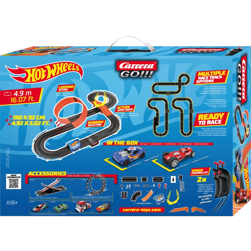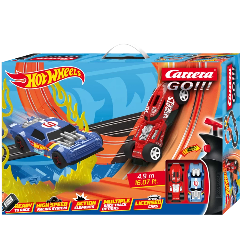Race met de populaire Hot Wheels™ auto’s over de Carrera Racebaan. Hot Wheels™ en Carrera hebben een handen in heen geslagen en het beste van deze twee werelden gecombineerd.