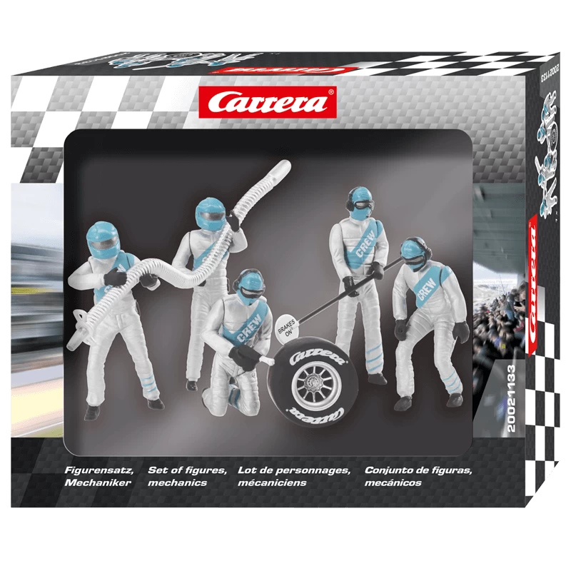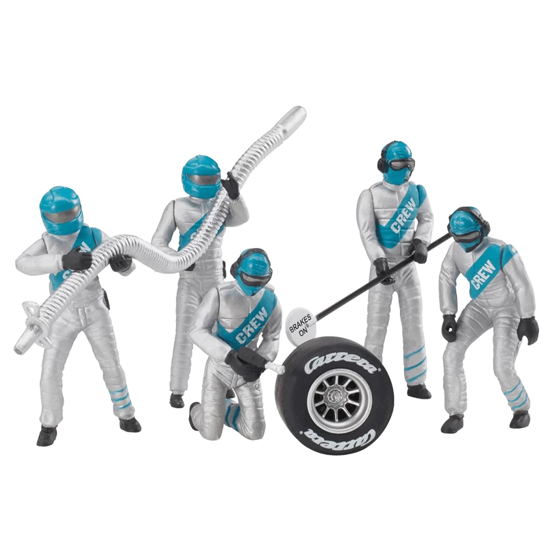 Zet deze Pitstop Crew in op de racebaan en de auto’s kunnen de Pitstop in voor onderhoud. Het “zilveren” team is goed op elkaar ingespeeld!