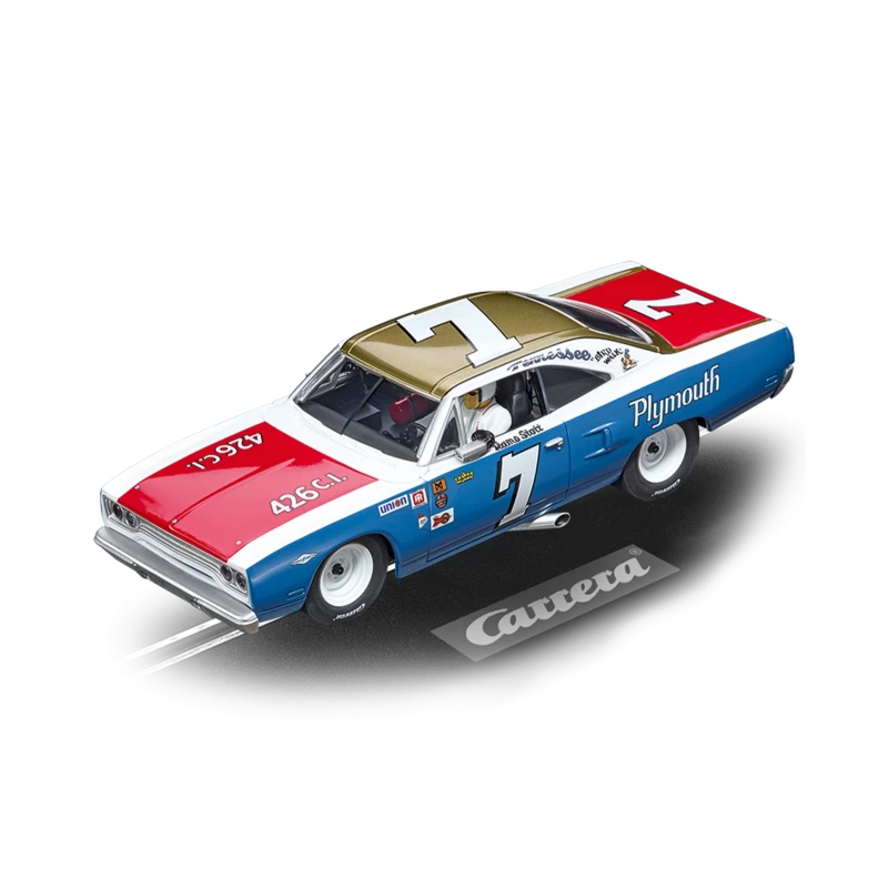 Deze Amerikaanse muscle car komt uit de jaren 70 en werd bestuurd door de Amerikaanse coureur Ramo Stott. De coureur uit Iowa vierde zijn grootste successen in de ARCA Menards Series, een Amerikaanse stockcar-raceserie die hij in 1971 en 1972 won. Deze klassieke rood-witte Plymouth auto – met goudkleurig dak – is in 2020 uitgebracht door Carrera en kan niet wachten om op jouw Evolution racebaan te racen. Â